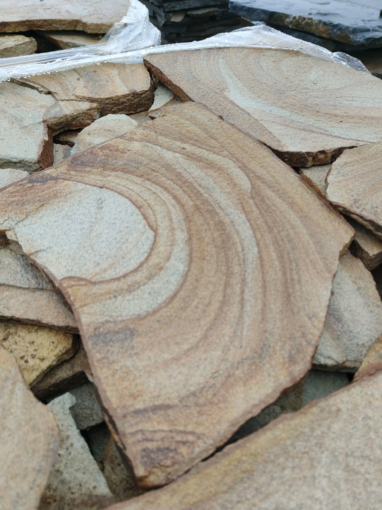 Песчаник жёлтый с разводами - для работ по мощению дорожек и площадок на землю и грунтовое основание, а также на песчано-цементно-щебёночное основание.